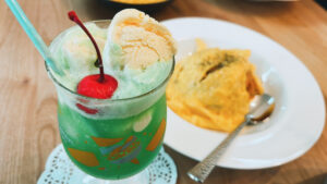 メロンソーダの緑色とさくらんぼの赤色の対比が鮮やかで、