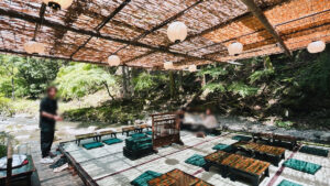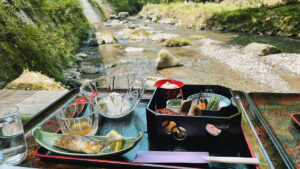 川のせせらぎにつつまれながらお膳を楽しみました。