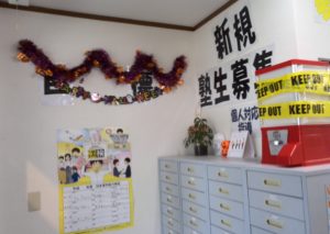さて、御器所校は教室の模様替えをして、ハロウィンっぽい雰囲気になっています。